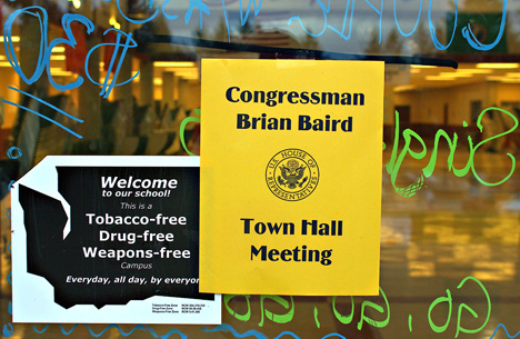 Olympia, Washington that is. One of Congressman Baird’s many town hall meetings where he attempted to explain his new found support of leaving the troops in Iraq for at least another six months.