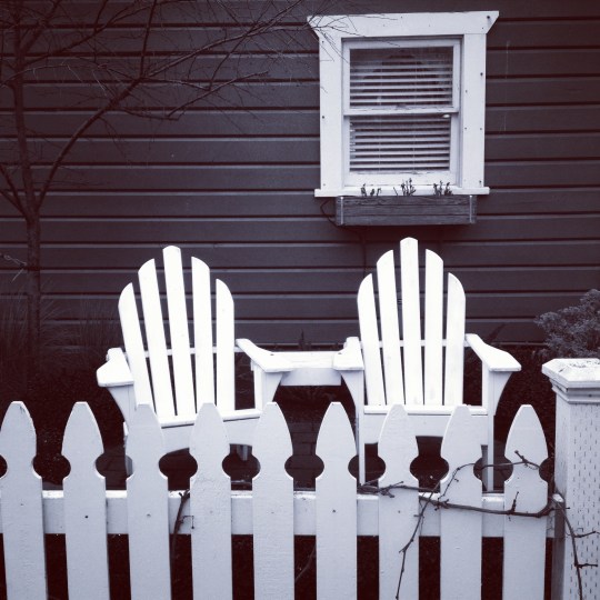 A seasonally lifeless tree clings to the hope of Spring as it finds itself rooted next to a colorless window that gazes down upon two colorless chairs who themselves can’t believe their good fortune at being surrounded by a fence of color-free proportion.